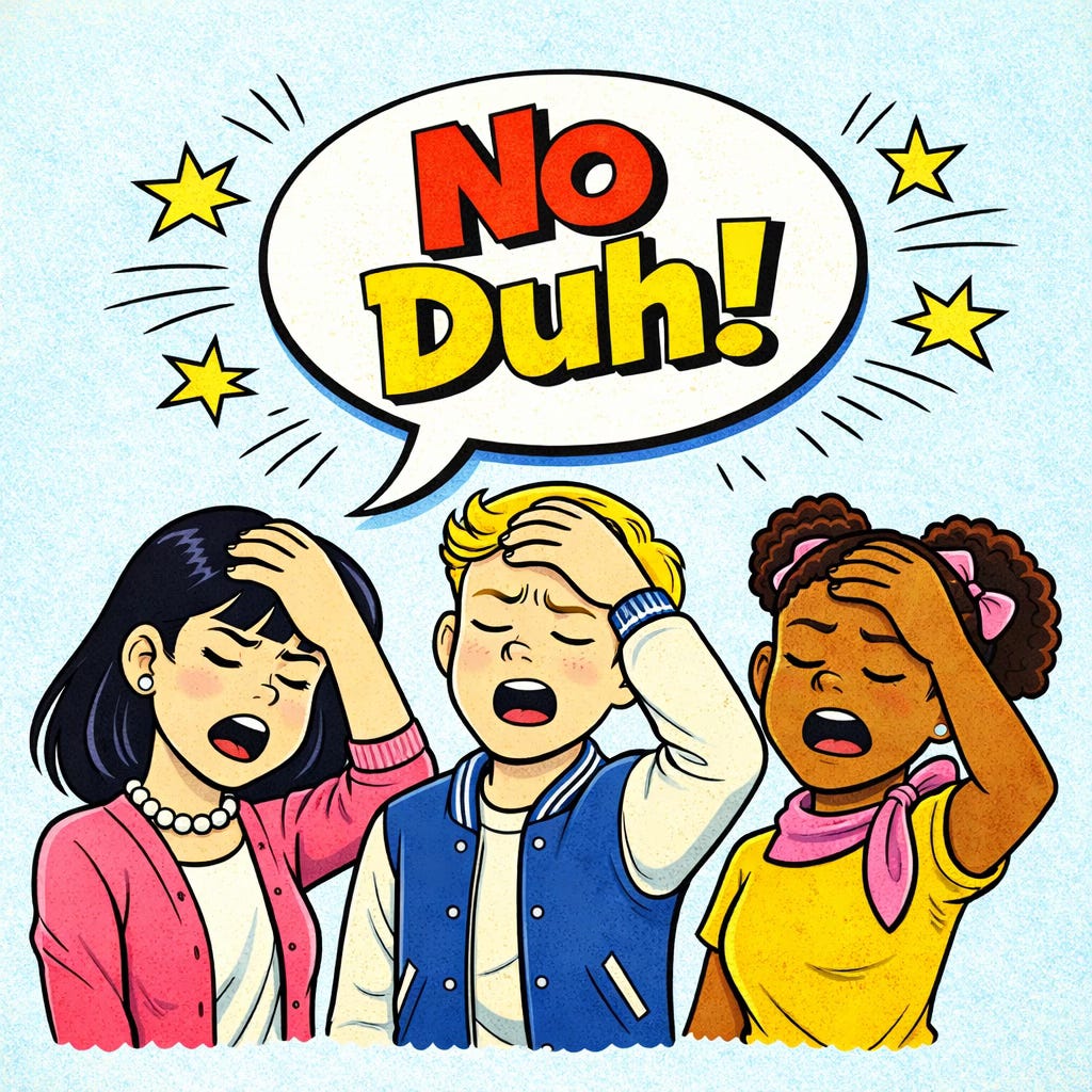 Like when your parents say, “Don’t touch the stove when it’s hot.” Or your teacher says, “Read the directions first.” Or your friend says, “Don’t forget to pick up the pizza.” You’d say, No duh.